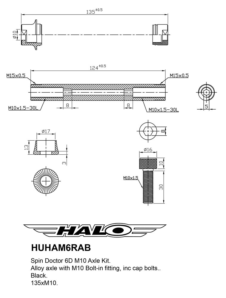 - Halo Spin Doctor 6D Axle Kit, Rear - M10 Bolt type axle kit for SD6D Hub, Inc. Internal alloy axle, Black, M10